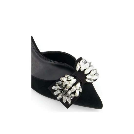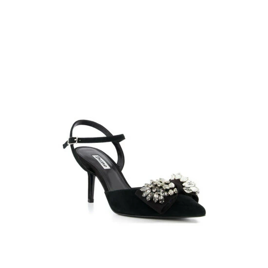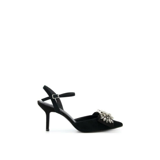 Every wardrobe needs that special stand out piece. These embellished courts will add a touch of enchantment to every step. Featuring a gem-encrusted bow they rest on an elegant high heel. The ankle the strap can be easily adjusted for a comfortable fit.