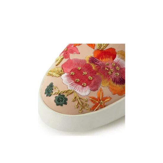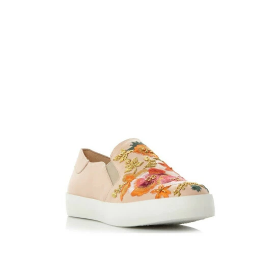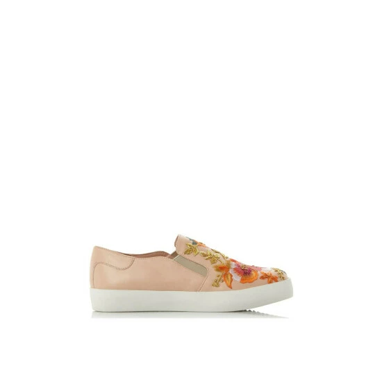 Update your off duty look with the Espyy slip on shoe from Dune London. The leather upper is adorn with floral embroidery detailing. Complete with elasticated inserts for easy slip on and a sporty cupsole.