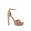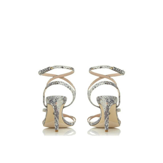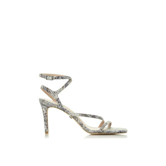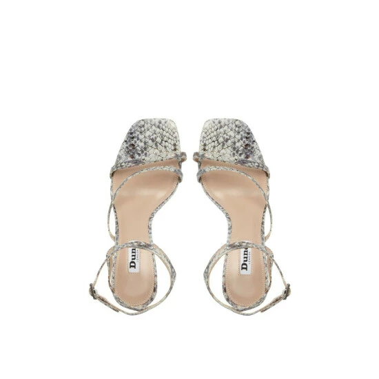 Complete your evening look with the Mighteys sandal from Dune London. In a comfortable slip on design and shaped with an open square toe. Complete with elegant ankle straps and rests on a sleek high stiletto heel.