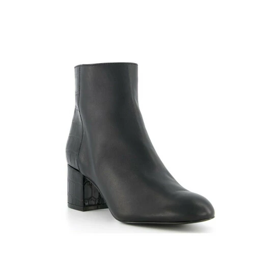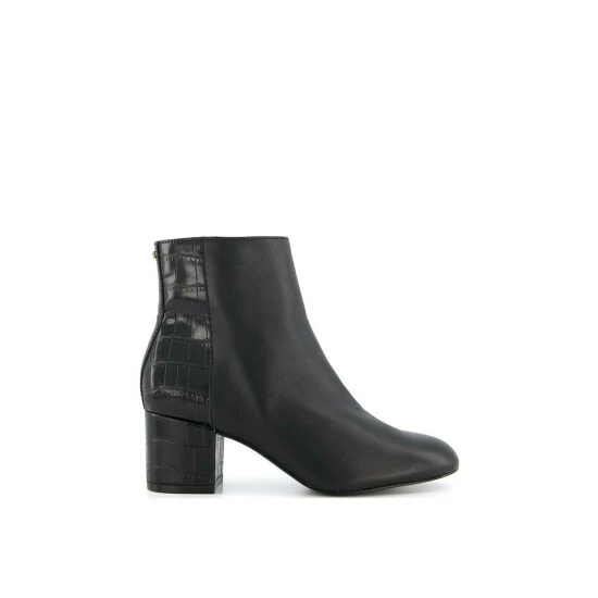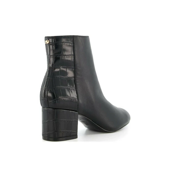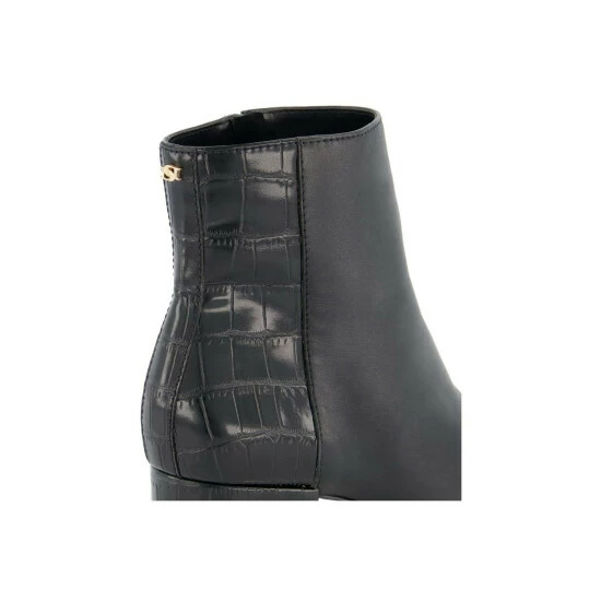 A chic and classic pair of ankle boots that will be your everyday go-to style. The mid height block heel making them perfect or all-day wear. Featuring moc croc detailing and a gold intertwined initial logo on the back.