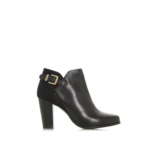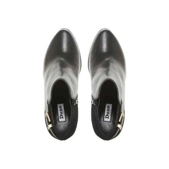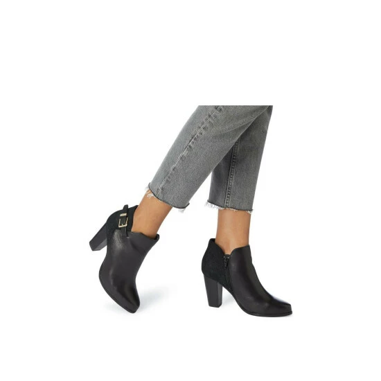 The Oleria ankle boot from Dune London is a stylish and versatile option. Elevated by a classic block heel and showcasing a mixed fabric upper. It is complete with gold-toned hardware and a buckle fastening.