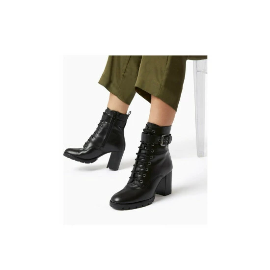 Crafted from leather these lace-up boots are a timeless style perfect for all seasons. With an decorative ankle strap and rear pull tab they also feature a comfortable cleated sole. With inside zip fastening, a slightly squared off toe and fashionable block heel these will be your go-to heels.