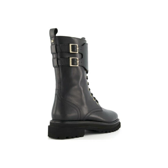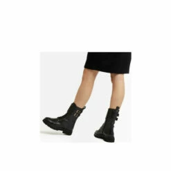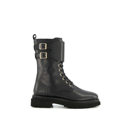 The definitive chunky sole lace up style to reboot your new season wardrobe. Team with feminine dresses or dress down with jeans. With sleek gold hardware and double buckle detailing around the top these will be your go-to boots this winter.