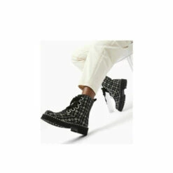 A feminine twist on the classic biker boot look. With pearl edging, these boots add a hint of delicate charm. Complete with thick laces, a pull tab and a cleated sole.