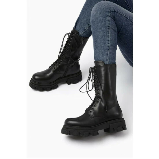 Toughen up your look with Dune London’s Roshi boots. The calf-length pair fastens up with biker-style laces. They’re finished with a chunky sole.